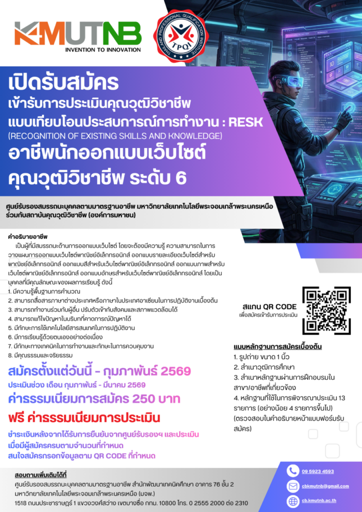 (รับสมัครตั้งแต่วันนี้ – กุมภาพันธ์ 2569) - อาชีพนักออกแบบเว็บไซต์ คุณวุฒิวิชาชีพ ระดับ 6 (แบบเทียบโอนประสบการณ์การทำงาน : RESK)