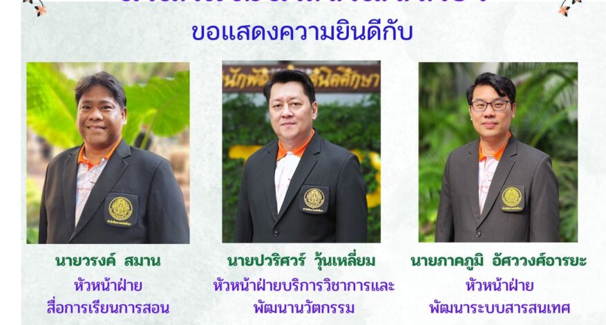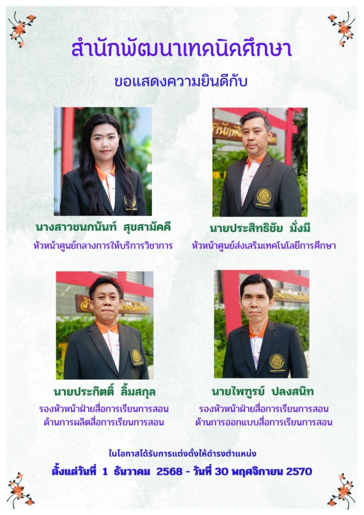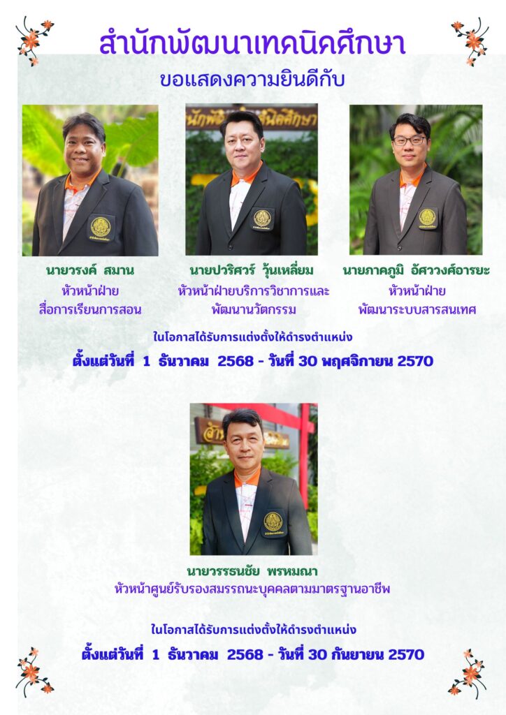 พร้อมกันนี้ ขอแสดงความยินดีกับหัวหน้าศูนย์ และรองหัวหน้าฝ่ายสื่อการเรียนการสอน สำนักพัฒนาเทคนิคศึกษา จำนวน 4 ราย ในโอกาสได้รับการแต่งตั้งให้ดำรงตำแหน่ง ดังนี้